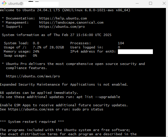 명령어를 입력하니, bash에서 원격으로 EC2 인스턴스에 접근할 수 있게 되었다.(windows powershell에는 권한 문제로 접속이 힘들어 git bash로 접속함)